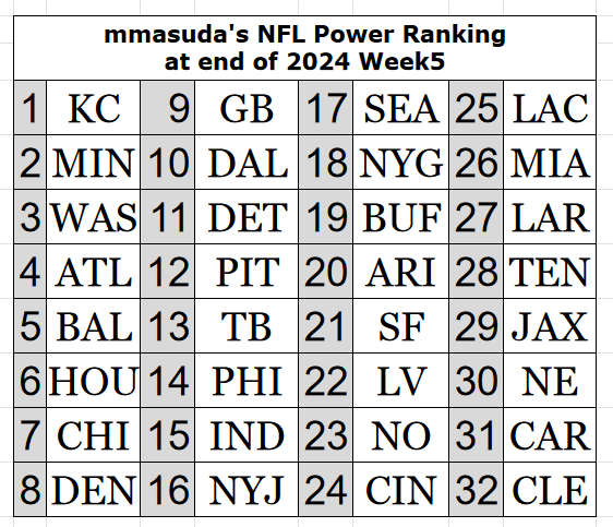 2024-10-09 mmasuda's NFL Power Ranking at end of 2024 Week5 NFL NFL Power Ranking アメフト 2024年Week5終了時点のランキングはこうなりました。 算出方法は以下記事で説明してます。 mmasuda.hatenadiary.org